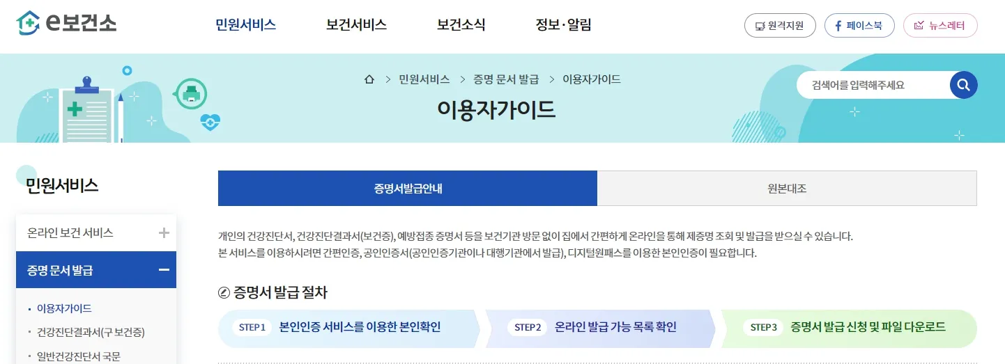 1. e보건소 공공보건포털 홈페이지로 접속해서 우측 동그라미 증명문서 발급을 클릭합니다.