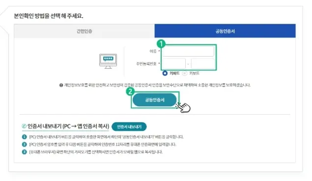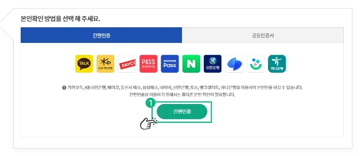 4. 간편 인증 또는 공동인증서를 이용해서 본인인증절차를 완료합니다.