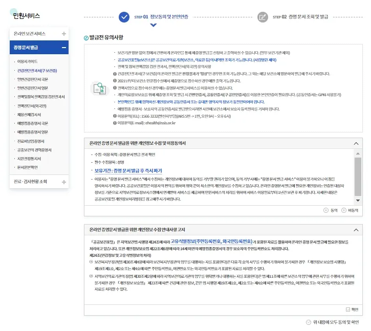 2. 좌측 증명문서발급아래 건강진단결과서(구 보건증) 클릭합니다.
