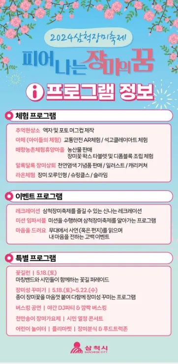 삼척장미축제의 일정 입장료 주차장 프로그램에 대해서 안내드리겠습니다.