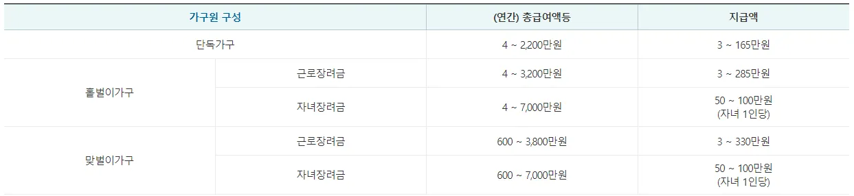 근로장려금은 최대 지급받는 금액은 맞벌이의 경우 330만 원이고 단독가구는 165만 원입니다.
