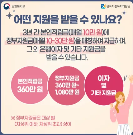 월 110만 원 이하로 벌고 있는 차상위계층은 한 달에 10만 원이 아니라 30만 원을 지원해 주어서 3년 뒤 1,080만 원을 더해 1,440만 원을 줍니다. 360 + 1,080 = 1,440만 원